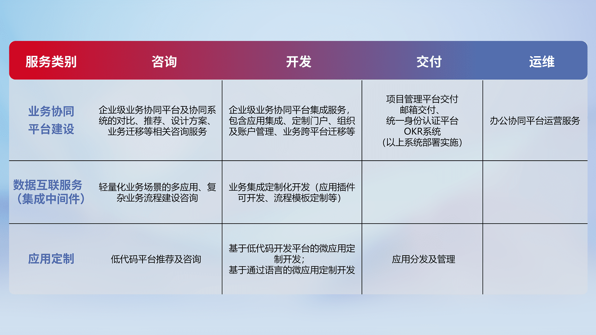 针对钉钉、、企微、、、、IDaas等平台级产品提供产品的规划、、方案、、、、交付、、、定制化开发等服务,,,实现如统一协同办公、、、、智能客户服务、、、、混合会议管理、、智能数据查询、、、等业务场景,,,,实现数字化转型。。。